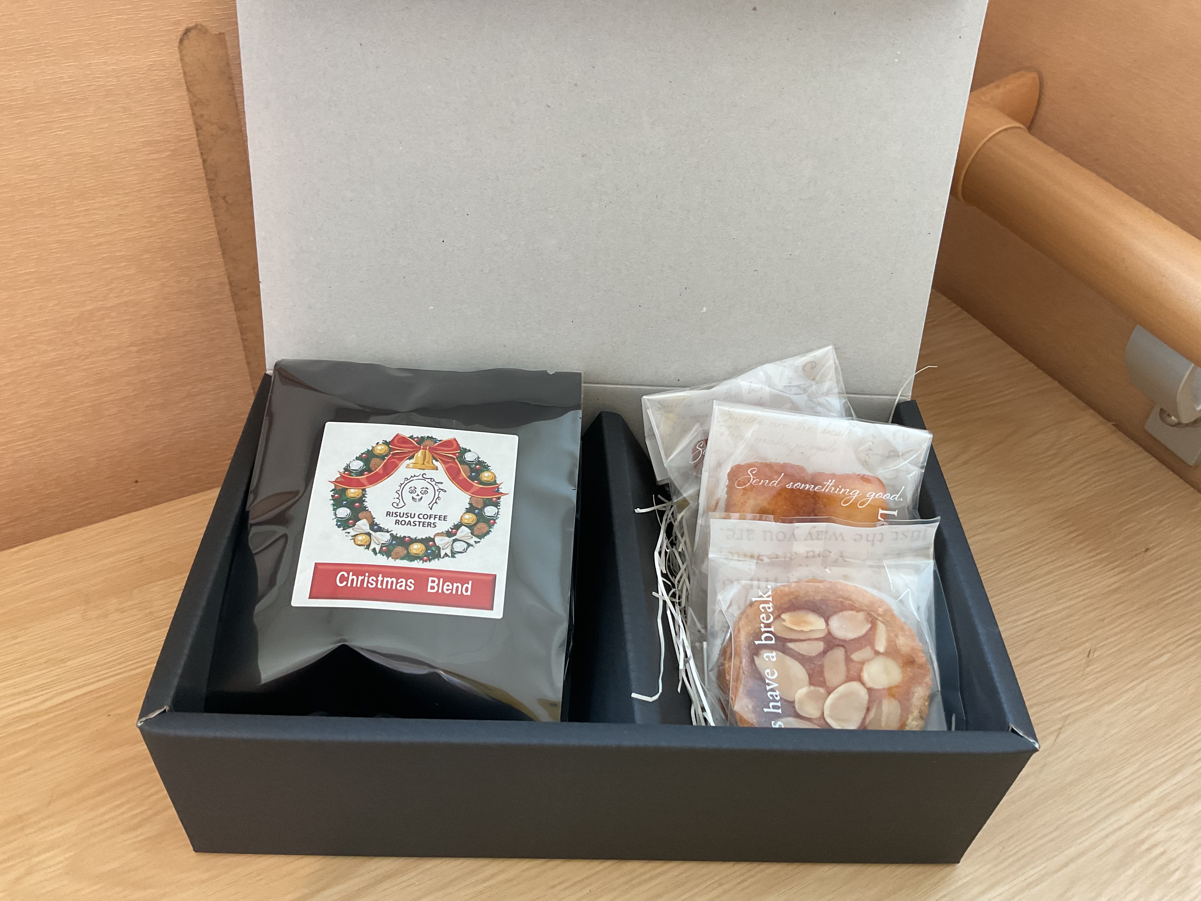 クリスマス限定のドリップバックコーヒーとよかよかくらぶの米粉フィナンシェ、タルトのスイーツ詰め合わせになります。ぜひお召し上がりください!